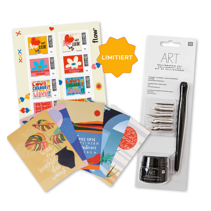 Limitierter Flow Briefmarken-Bogen, schöne Flow Postkarten und Kalligraphie-Set von RICO Design. Perfekt zum Schreiben von lieben Botschaften aus der Ferne.